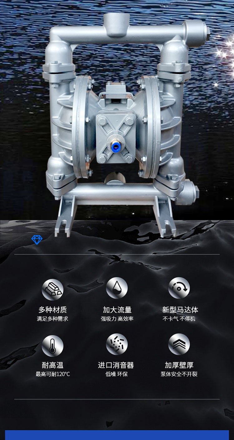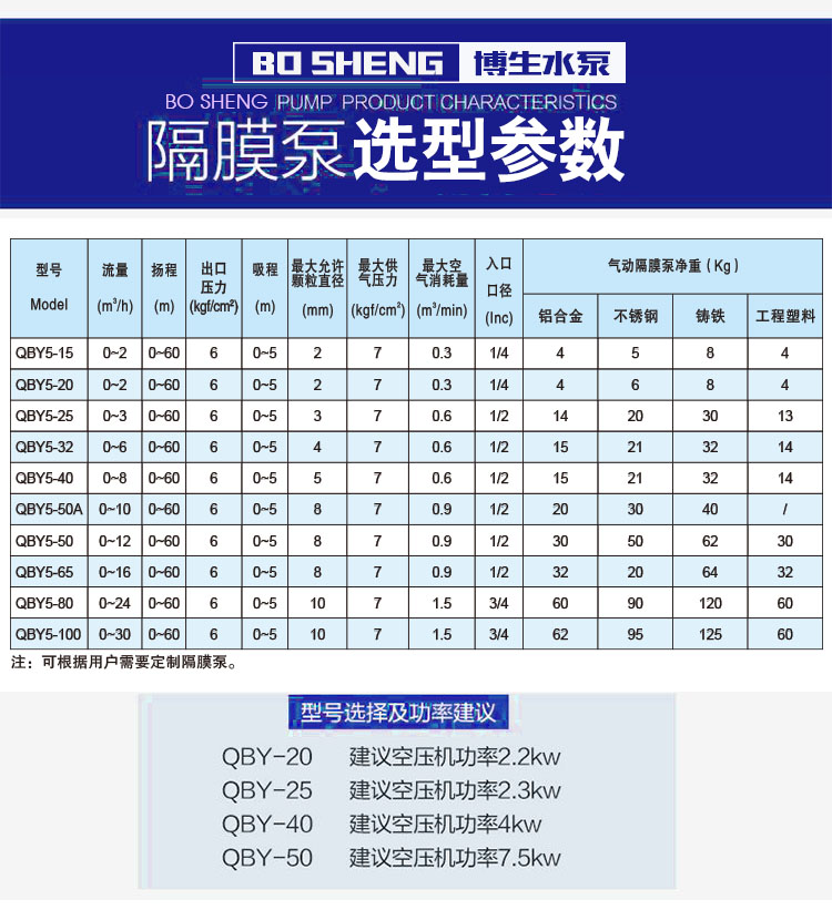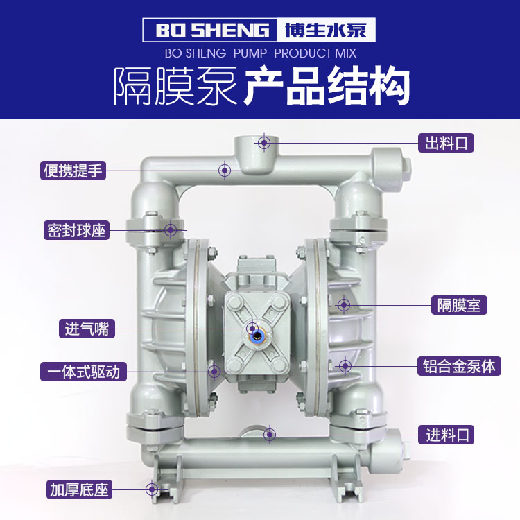 上海博生水泵QBY5-40L型鋁合金氣動隔膜泵,油墨泵,耐腐蝕氣動隔膜泵,污水排污氣動隔膜泵系列第五代氣動隔膜泵是一種新型輸送機械,采用壓縮空氣為動力源,對于各種腐蝕性液體,帶顆粒的液體,高粘度、易揮發、易燃、劇毒的液體,均能予以抽光吸盡。其性能參數與聯邦德國的WLLDENPVMPS、美國的MARlOWPUMPS相近。